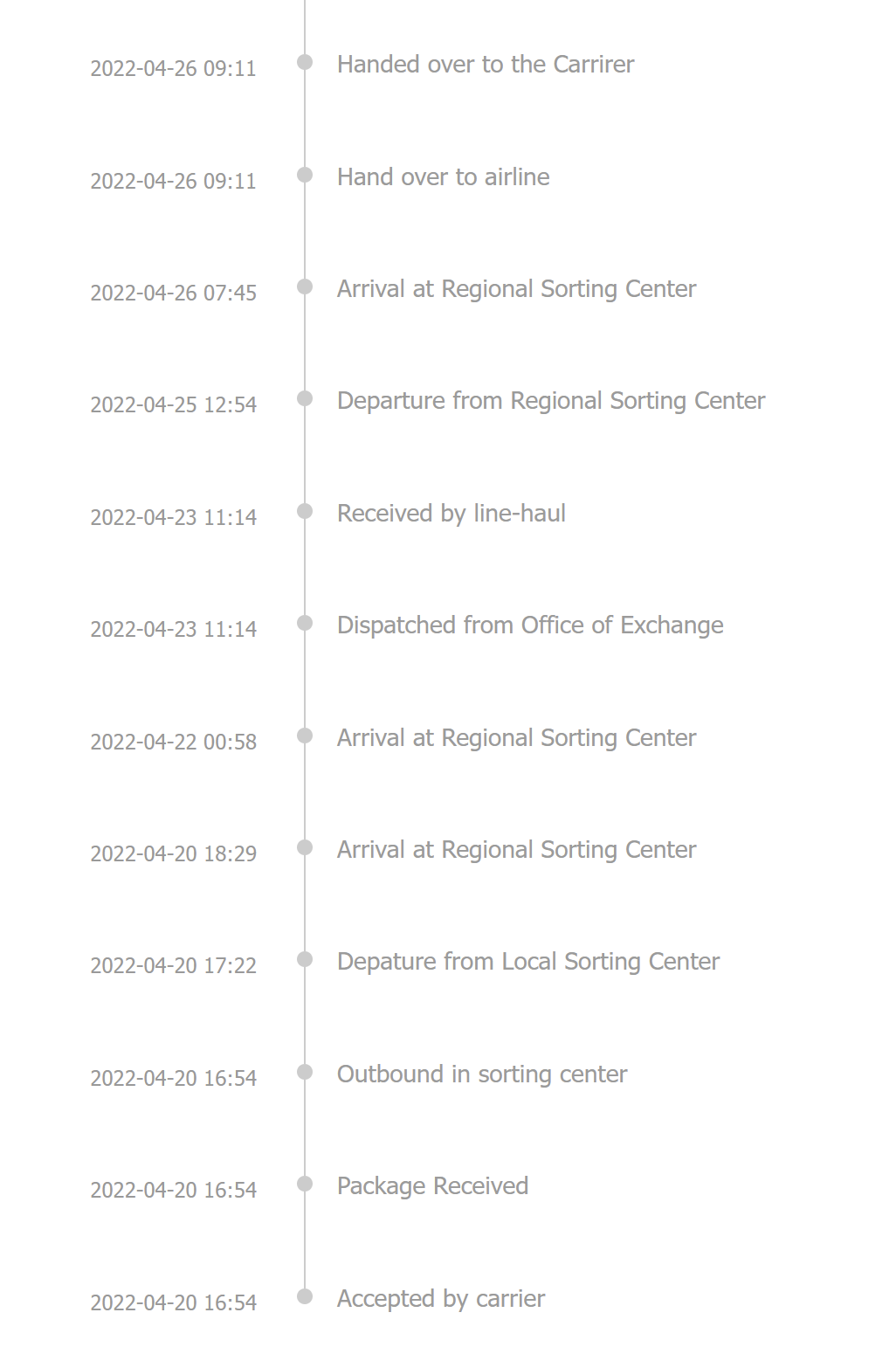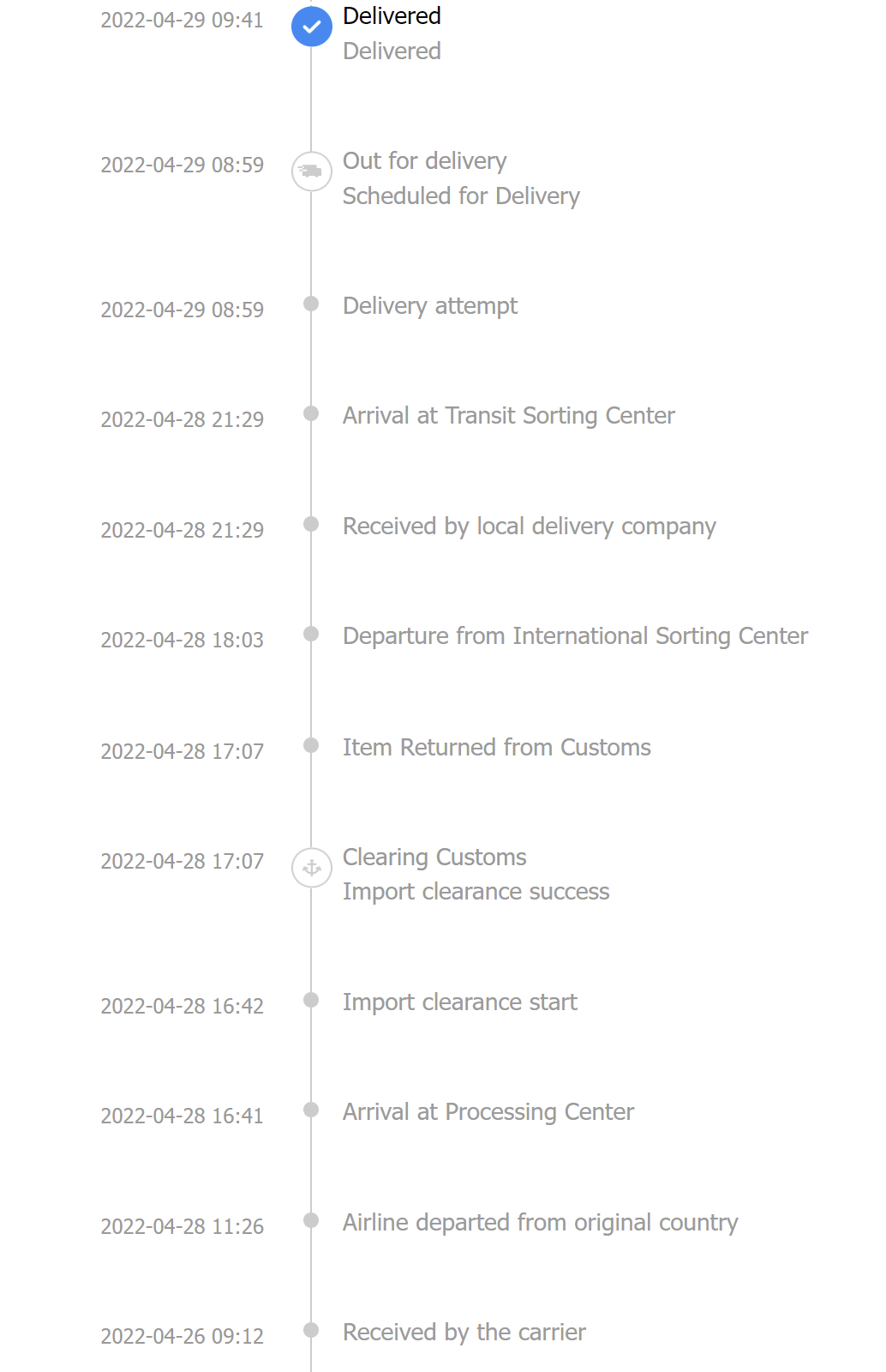 그리고 고객에게 배달된 날짜가 4월29일이다.